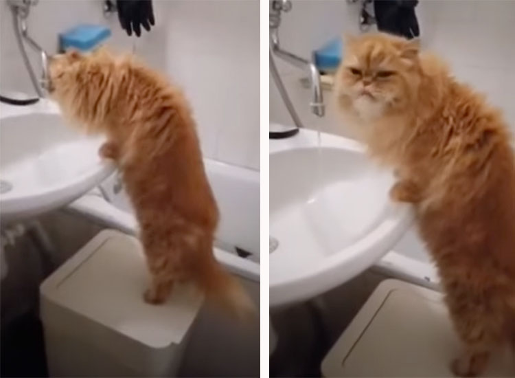 ここがあたしの水飲み場なの。洗面台で水を飲みたがる猫さん。