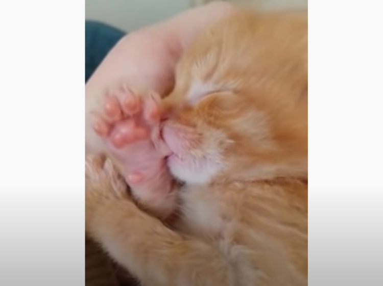 肉球をチュウチュウ…可愛すぎる子猫の寝顔。