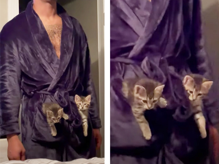 かっこいい紫のバスローブ姿で キメ顔で登場した男性。 普通にスタスタと歩いているのですが そのポケットには... 可愛い子猫の兄弟が♪ この2匹の小さな子猫さんたちは、 男性の奥さんが発見した子猫を 全員里親を探すという条件で 一時的に保護していたそ...