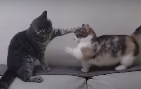 ソファの上で、 睨み合っている2匹の猫さん。 これは、ケンカが始まるかな? 緊張が高まっていき、 2匹がほぼ同時に、 猫パンチを繰り出すと! あぁ〜...悲しいことに短足の猫さんの 渾身のパンチは相手に届かずに 頭にポスっと手を置かれてしまいました。... -