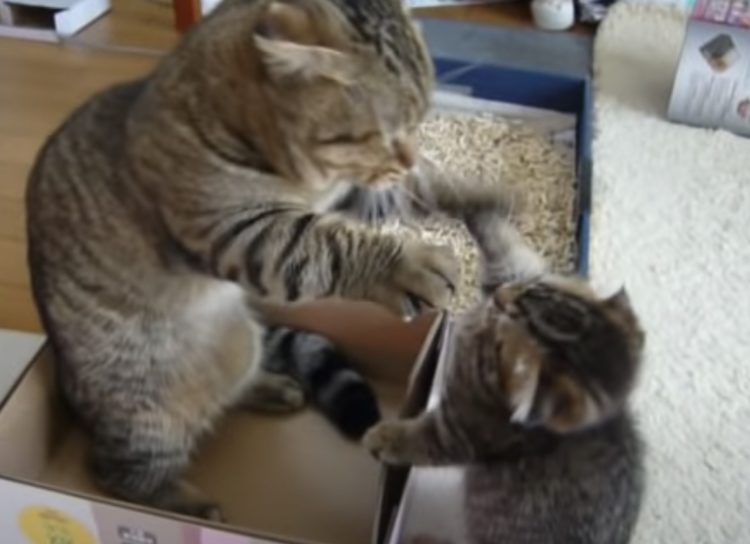 お父さんと遊びたい子猫さん。 箱の中でくつろいでいるところに 子猫「パパ〜遊んで〜!」と かまってアピールをしますが、 お父さんは今はゆっくりしたいんだよ〜。と やり過ごそうとしますが、 子猫は立ち上がってお父さんをポカポカ! なんで遊んでくれ...