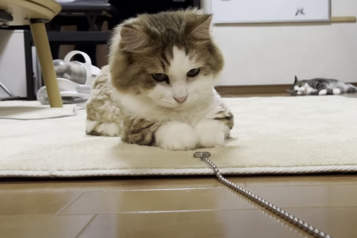 チェーンで遊んでいるのは ひのき猫一家の猫さんたち♪ チャラチャラ、カチャカチャ、 音がするチェーンを猫じゃらしのように 捕まえようとみんなで夢中に! 一番おもちゃに食いついたのは、 子ども猫さん...ではなく お父さん猫の秀吉くん! マンチカンな... -