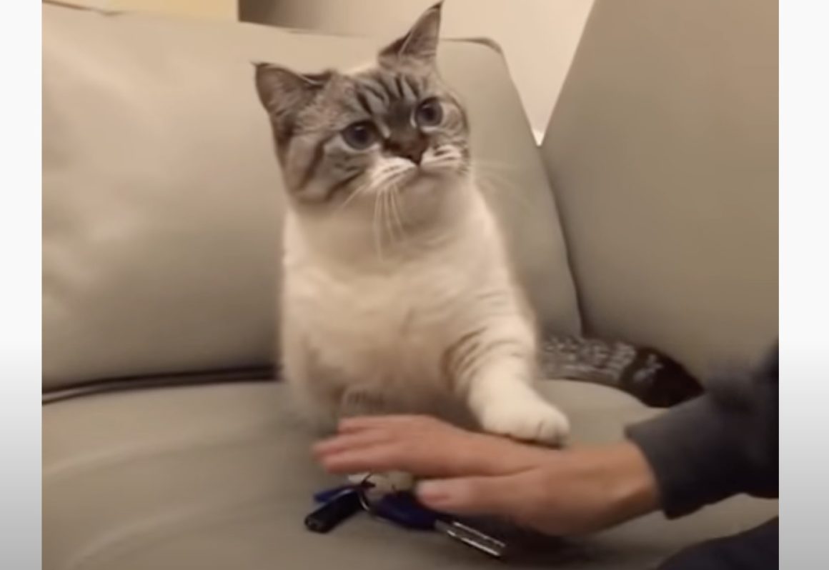 うるうるとした丸い目で 飼い主さんのことを見つめる猫さん。 ナデナデして欲しいわけでもなく、 じーっと飼い主さんのことを見つめる理由は 他にあったようです。 猫さんの足元に置いてある鍵を、 飼い主さんが手に取ろうとすると、 優しくソフトタッチを...