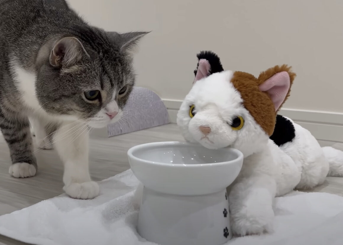 ぬいぐるみにゴハンを取られちゃう!? 焦った様子が可愛い猫。