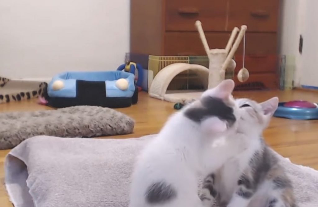 お部屋で戯れる2匹の子猫。 子猫が2匹、それだけでかわいさがすごい。 毛づくろいでもしてるのかな〜と様子をみていると... ん...ちょっとラブラブがすぎないかい....?(照)