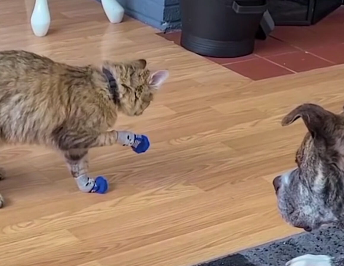 前足に青い靴下のようなものを 装着してお部屋をウロウロしている猫さん。 寒そうだったので履かせてみたのでしょうか、 赤ちゃん用の靴下のように見えます。 でも猫さんはこれが邪魔でしょうがないようで 「歩きづらいし! 邪魔なの!」と なんだか困って... -