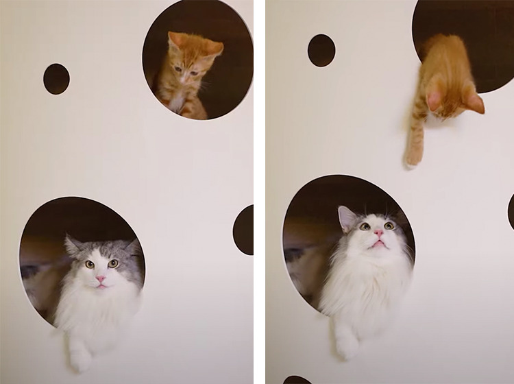 えいっ! えいっ! あれ? 届かにゃいな...? キャットタワーの上の方から 下にいる先輩猫に向かって ちょっかいを出そうとしている子猫さん。 自分の腕の長さが まだ短いっていう自覚がないようで 遠い場所から諦めずにえいえいっ!! 先輩猫さんは「なに... -