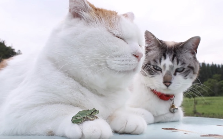 カエルが手の上に!手前の猫「いいんやで」奥の猫「なんやお前」