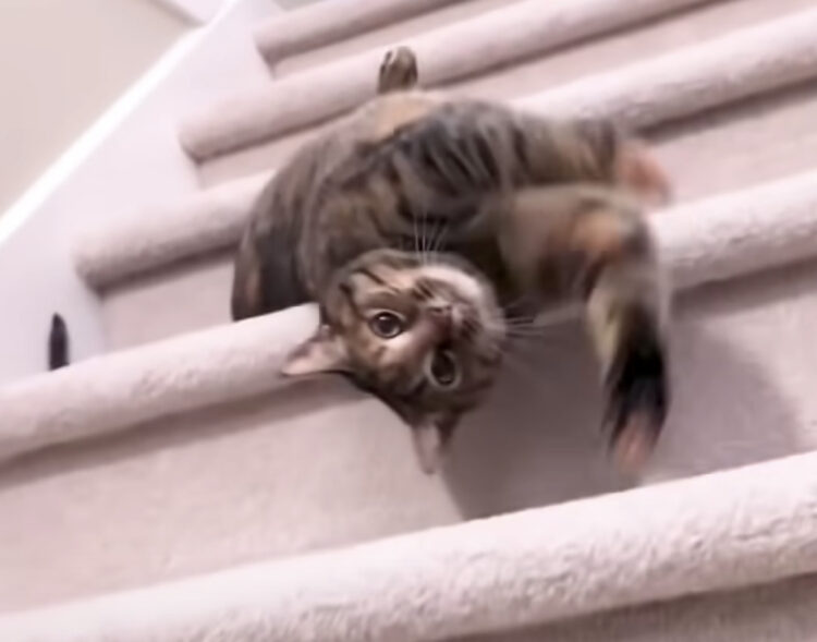 「1日5回は階段から転がる猫」 とタイトルが付けられたこちらの動画。 足を踏み外して落ちちゃうの...!? というわけではなく、 自分から階段を使って様々な方法で 転がり落ちていくのです。 まずは背中をスリスリするように 背中を擦り付けて階段からコ...