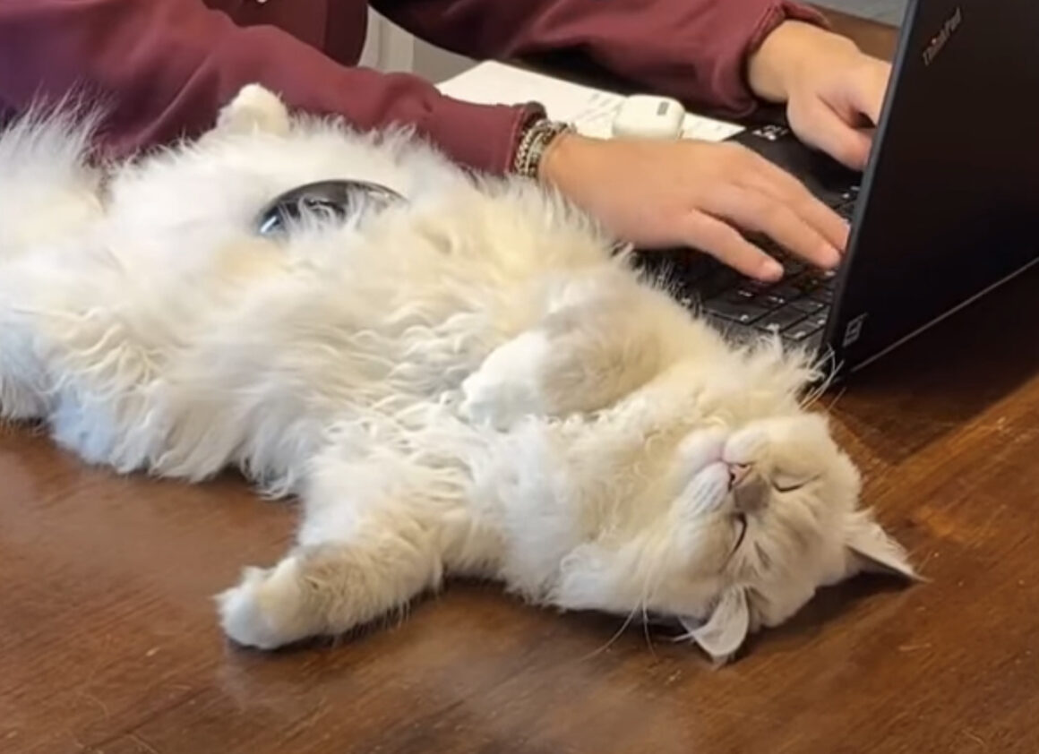 モフモフ猫さん、飼い主さんのデスクで寝てたらマウスパッドにされちゃった。