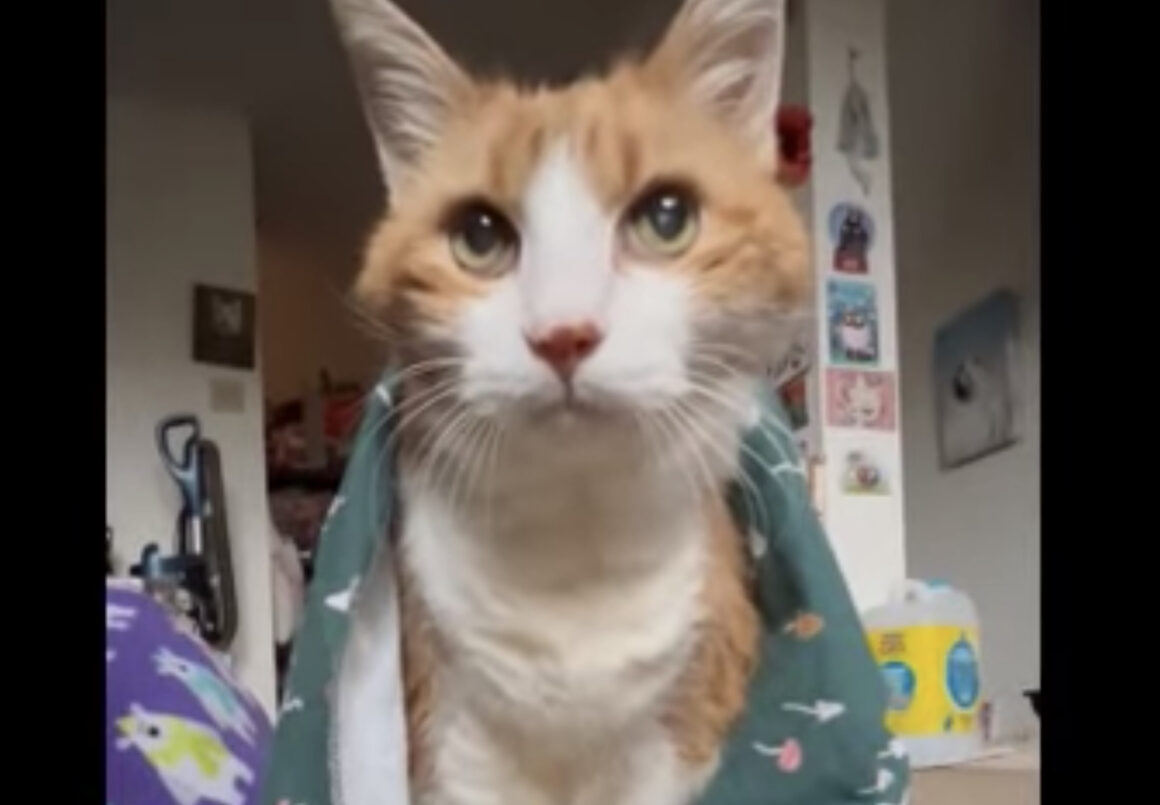 貰ったブランケットが気に入った猫さん、嬉しくてずっと肩にかけて離さない♡