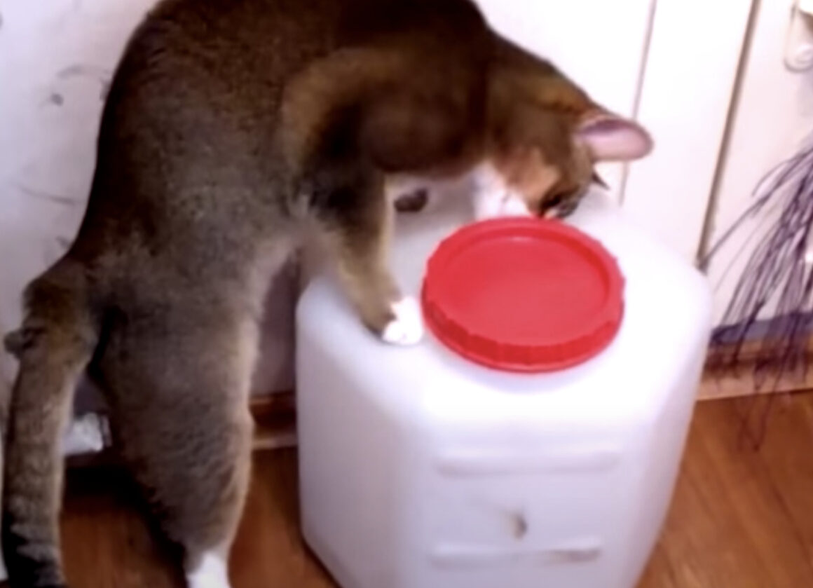 天才だ!頭と体を使ってタンクを開けちゃう猫。