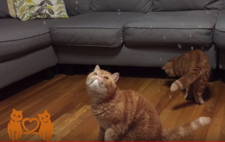 ふわふわふわ〜っとお部屋に舞うシャボン玉、 なにこれ?! っと興味津々な猫さんたち。 クンクンしようとして、お髭にピトッとシャボン玉が! 慌てる様子も捕まえようと頑張る様子も可愛い シャボン玉で遊ぶ猫さんなのでした。 出典:Seamus And Angus -