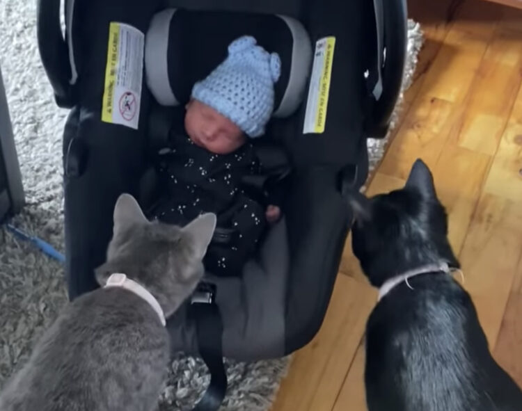 「小さい人間が来たぞ?」初めて赤ちゃんを見てソワソワする猫たち。