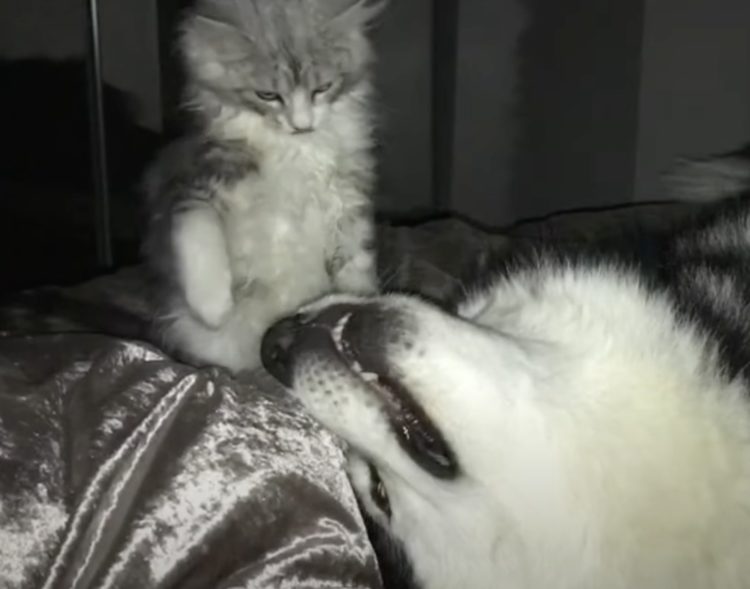 暗い部屋ですやすや寝ている犬さん。 それを見ていた子猫さんは、 退屈していたのか、かまって欲しくって仕方ない様子。 えいっ!と犬さんに飛びかかったり、 ガブっと甘噛みしたり、 ポカポカと顔を叩いたり...。 とにかく犬さんを寝かせる気はないのです... -