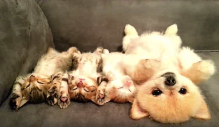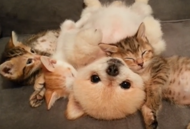 可愛すぎてくるしい。三匹の子猫と子犬が一緒にお昼寝すると…