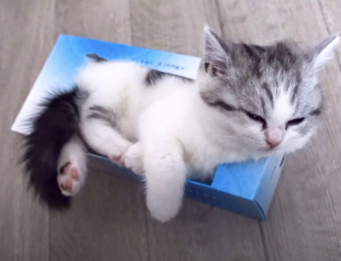 遊び疲れたスコティッシュ子猫、ベッドに選んだのはティッシュ箱!