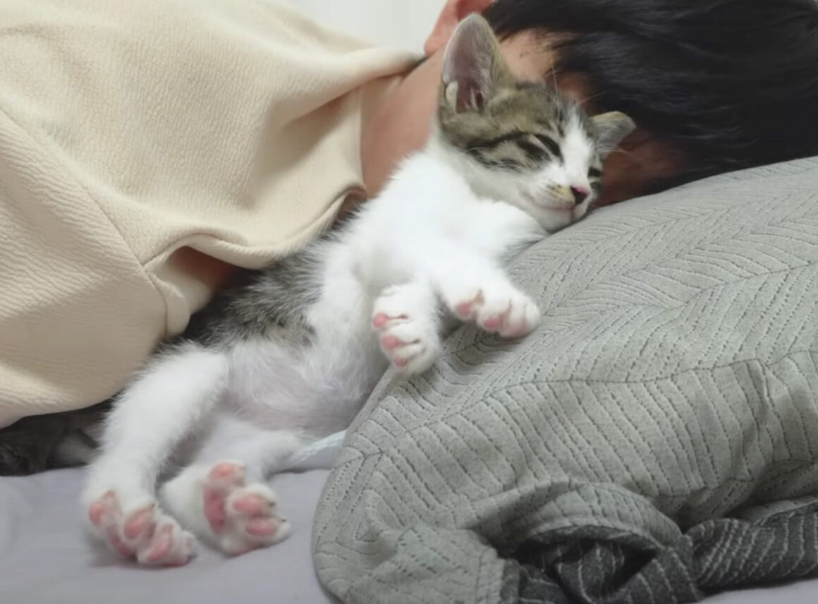 子猫が無邪気に遊ぶ姿も可愛いですが、 ついさっきまで走り回っていたのに いきなり睡魔に襲われて寝ちゃう姿も 赤ちゃんっぽさが残っていて とっても可愛いですよね。 こちらの子猫さんも、飼い主さんの膝の上で 毛づくろいをしていたら、突然眠気が... ...