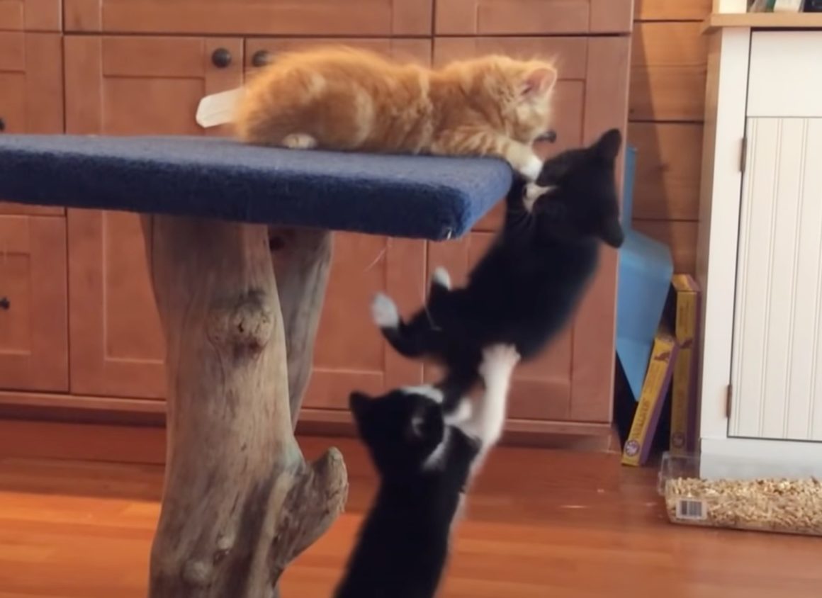 キャットタワーに挑戦する子猫たち。あと一歩が届かない!