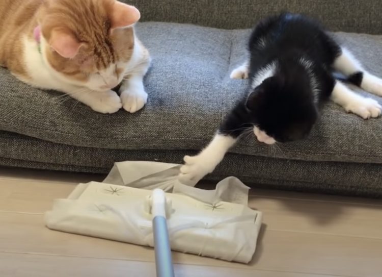 飼い主さんがお掃除を始めると、 じーっと見学している猫さんたち。 ちょっと怖さもあるので、 安全だと思っているソファの上から モップをちょんちょんと触ってみたり 興味津々の様子です。 特に子猫さんの方は、動くモップ夢中で 飛びかかってはソファに... -