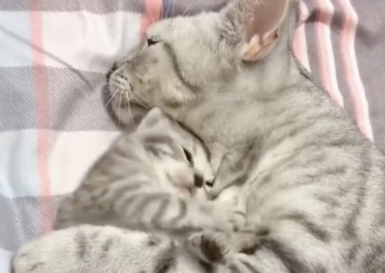 ママにハグされて眠る子猫。ひとりで平気だもん!と可愛い意地を張る。