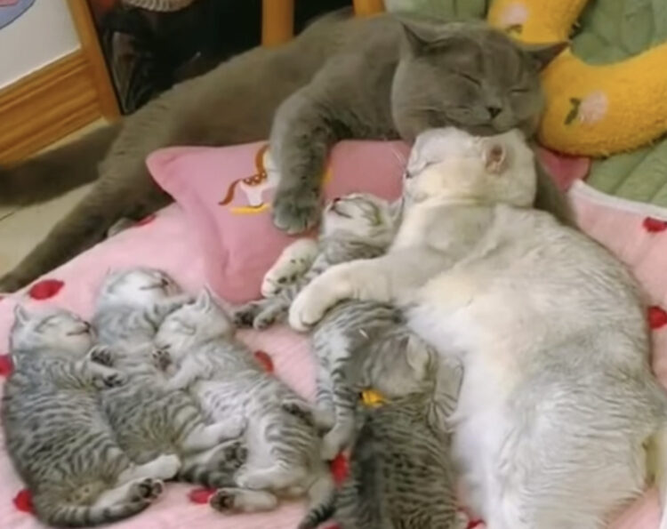 枕は子猫とママに譲って… ほっこりする猫さん一家のお昼寝姿。