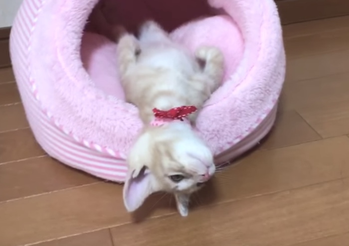 いやいや、どうしたん? 警戒心とかそういうの、どこいったん? なにがあったん? といろいろ聞きたくなってしまう体勢の子猫さん。 ここまで安心できるおうち、しあわせですね。