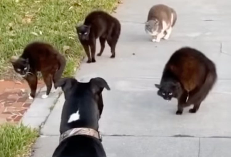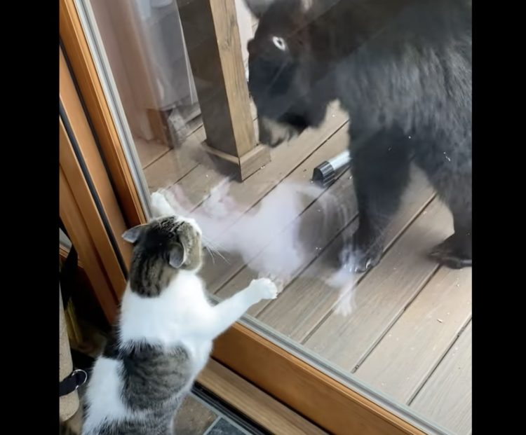 うちには入れニャいから!クマに立ち向かう勇敢な猫。
