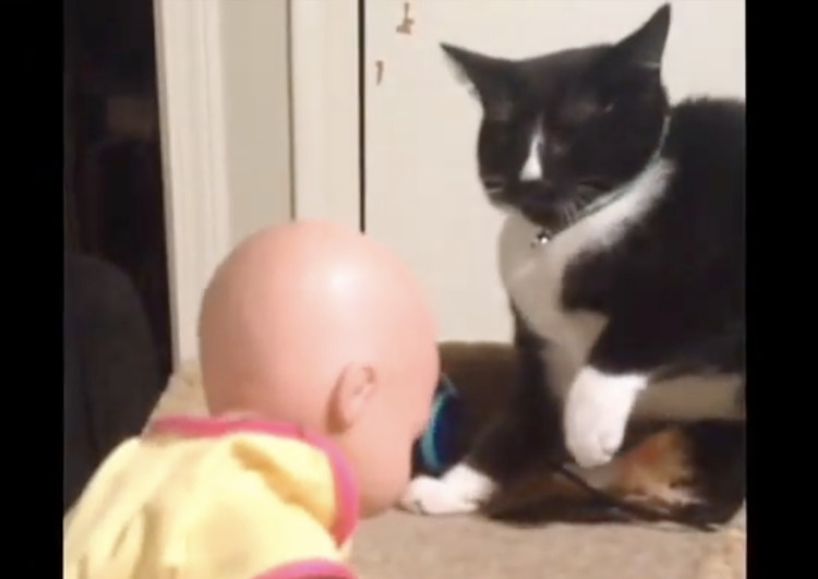 にゃんだよお前は〜!突然現れた赤ちゃん (人形) にキレる猫。