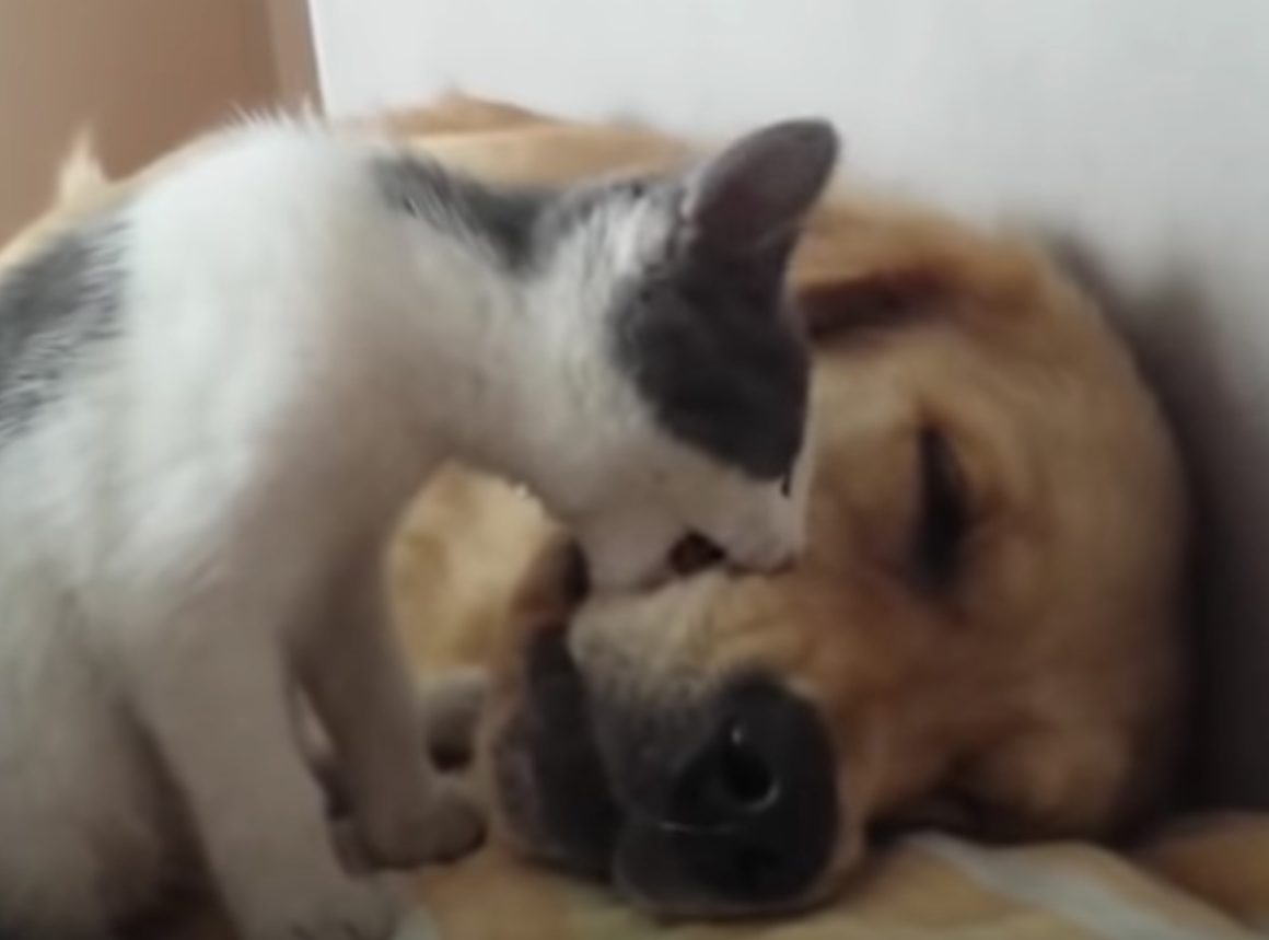 子猫「起きるニャ!」強引に犬を起こそうとして…ガブッ。