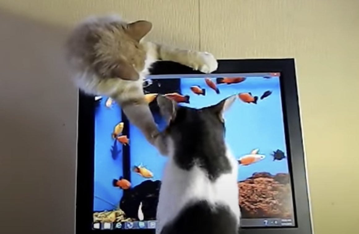 画面をひっかきたい猫VS止めたい猫。可愛すぎる攻防戦開始!