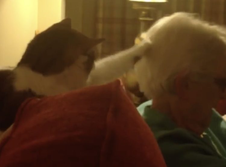 「(ポカポカッ)遊ぼう?」おばぁちゃんの頭に猫パンチをする猫さん。