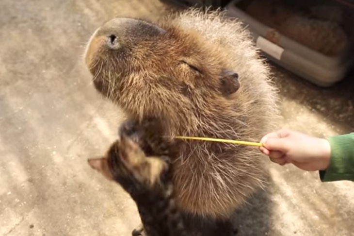 カピバラさんと、その手前に子猫。 カピバラさんはなぜか気持ち良さそうな表情です。 なんて顔してるん... そして時々カピバラさんののど付近に飛びつく子猫さん。 その理由は、ねこじゃらしでした。 カピバラさんはマッサージされていたんですね! 子猫に...