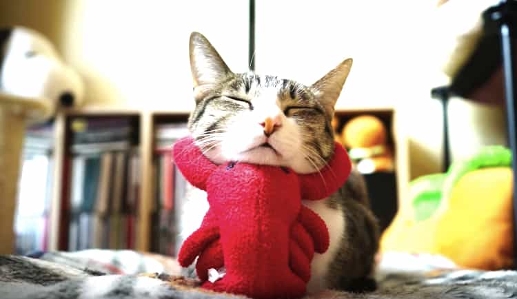 ぼーっと前を見る猫のおはぎさん。 その首元には… ザリガニのぬいぐるみが。 挟まれちゃってるよ〜! きゅうっと目を細めて眠る猫さん、 気持ち良さそうでほっこり〜。 出典:MAKO0MAKO0 / まこまこ -