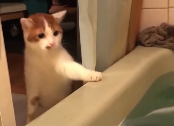 好奇心旺盛な子猫さん。 飼い主さんがお風呂に入っている時に 中の様子が気になって浴室に侵入! 見慣れないものや、ポカポカする場所に ウキウキして浴槽のフチまで登ります。 しかし、冷静になって周りを見渡すと、 足元は苦手な水がいっぱい!! 後悔し... -
