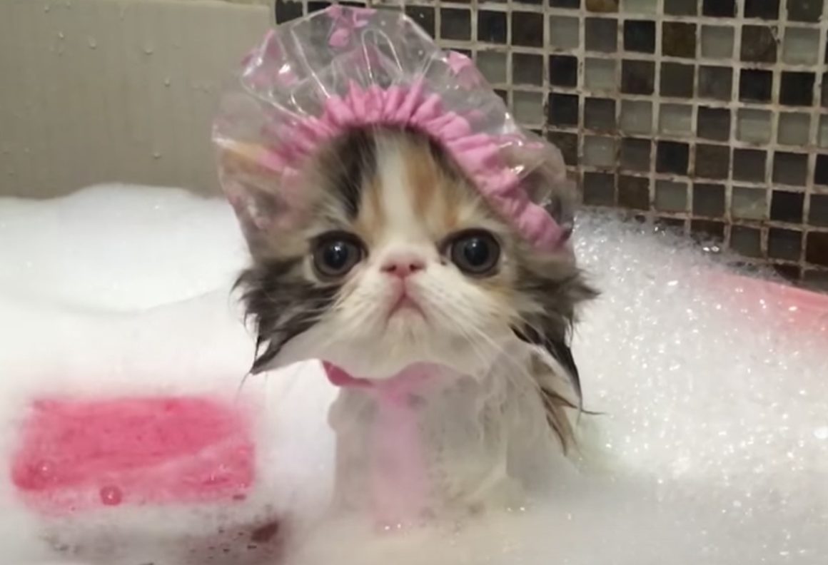 子猫「これがあれば平気なの♪」シャワーキャップをつけて入浴!