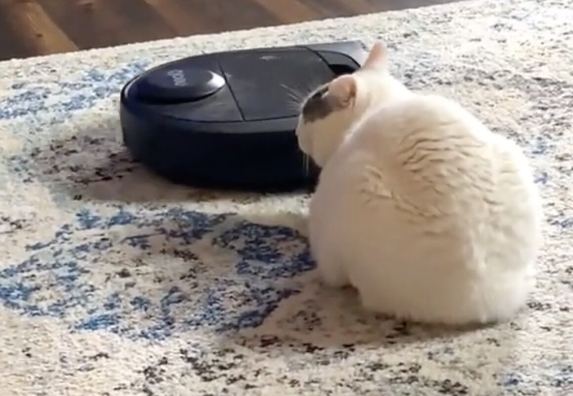 テレビの前から動きたくない猫、お掃除ロボットにぶつかっちゃうよ!