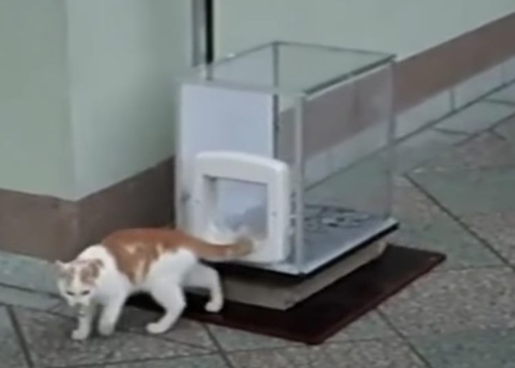 愛猫のアイビーちゃんの為に いつでもテラスに出られるよう、 窓にキャットドアを取り付けた飼い主さん♪ 「ほら、これで外に出られるよ」と パカパカ開けて外に出られることを 猫さんに教えてあげます。 早速窓の近くにやってきた猫さんですが ...ちょっと... -