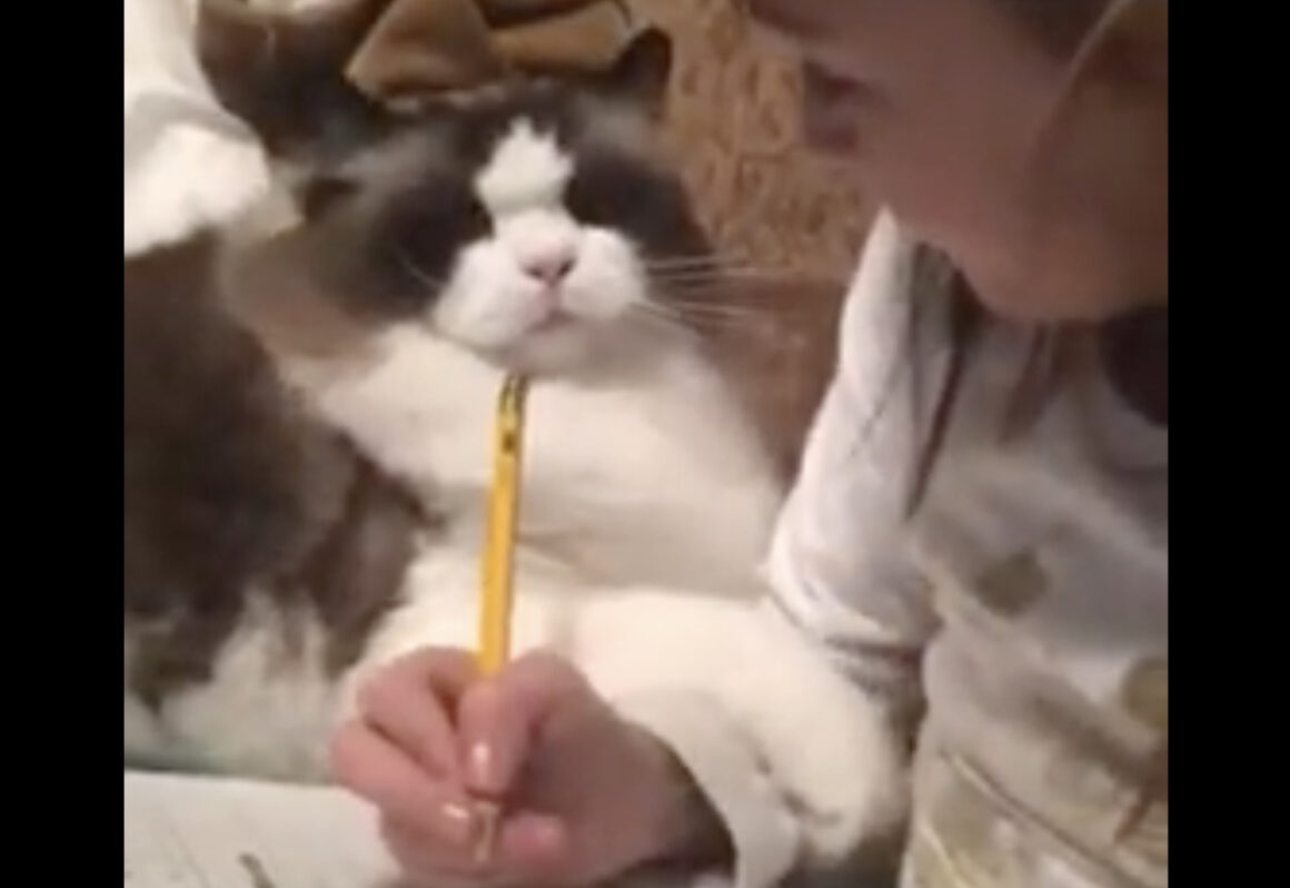 目の前にペンがあるとついつい… 勉強の妨害をしちゃう猫。
