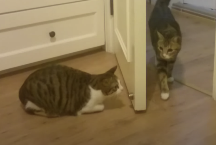 成功するかな?ドアの裏に隠れて猫のドッキリ作戦!