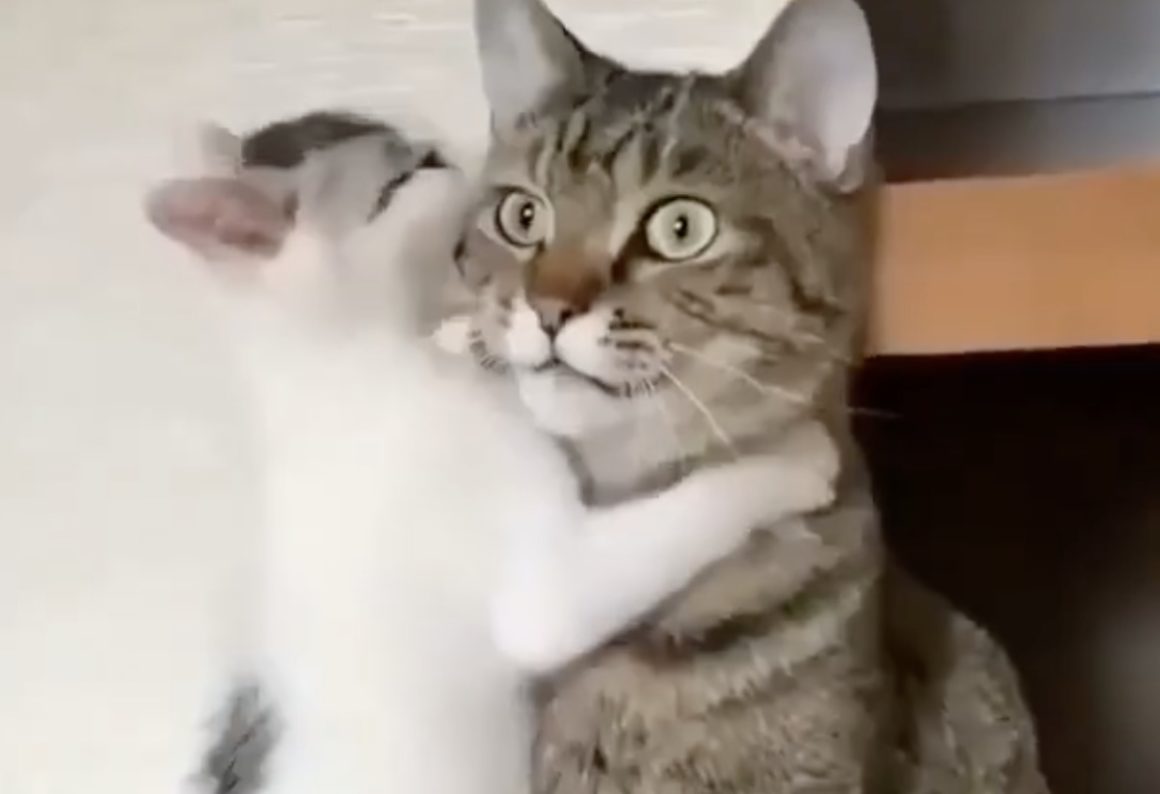 子猫さんと、一緒に暮らしている成猫さん。 子猫さんがじゃれついてきて ハグをしてきてぎゅ〜っ!! そのまま顔をカプっと噛んだり、 子猫さんやりたい放題です。 そんな状態にしばらく耐えていた成猫さん。 「我慢するにゃ...」と 自分に言い聞かせるよ... -