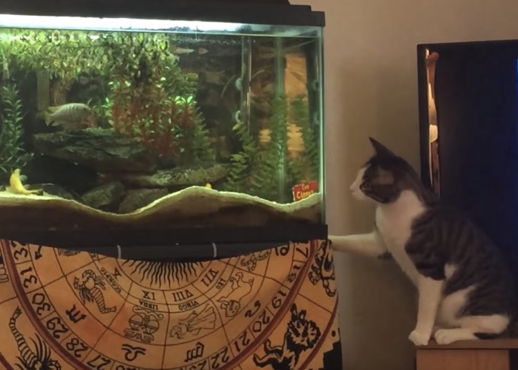 水槽の中の魚をじっと狙う猫。嫌な予感…が思わぬ方向に!
