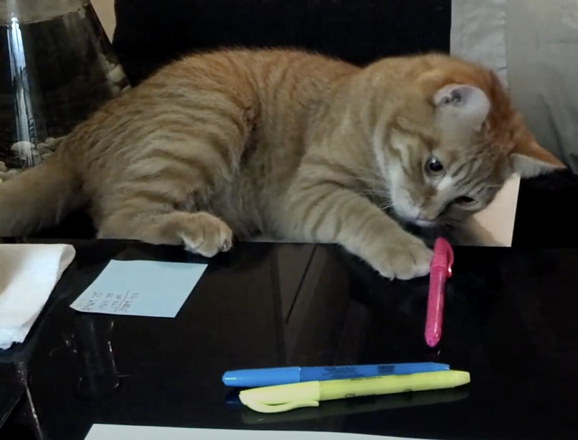もっとペンちょうだい!机の上には猫が喜ぶものがいっぱい!