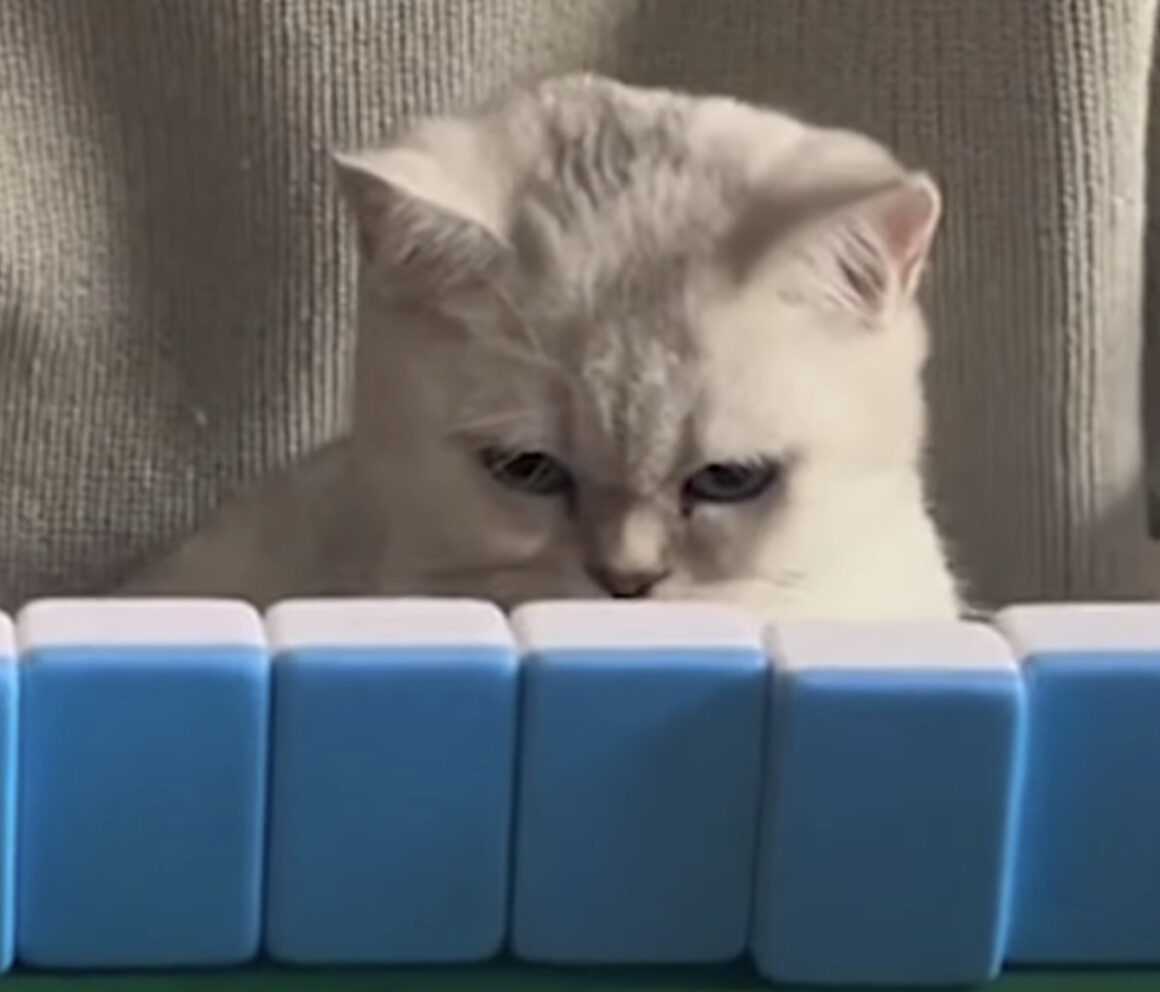 麻雀牌を真剣に見つめる猫、デキそうな顔してる!