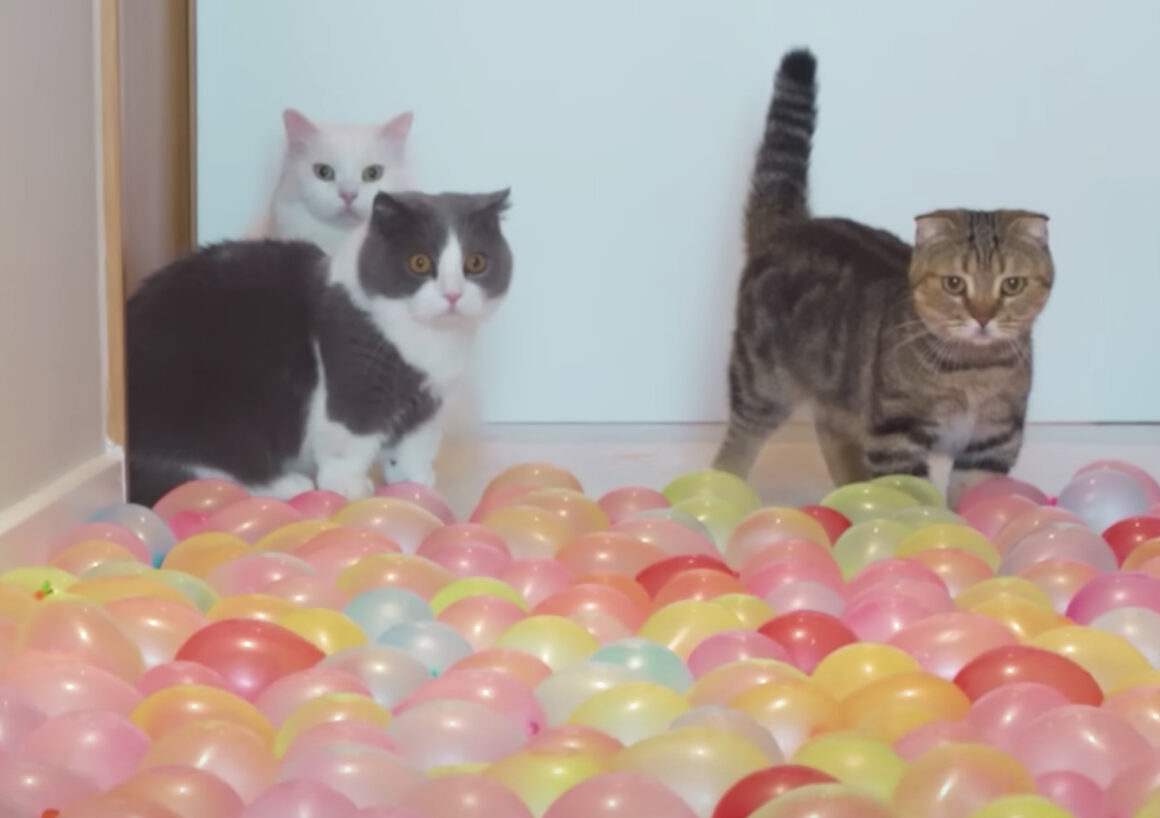 短足猫のマンチカンちゃんたちと、 一緒に暮らしている飼い主さん。 この日は猫さんたちのために たくさんの水風船を用意。 これで一緒に遊ぼうと、 床に敷き詰めてみました♪ 見慣れない物に、猫さんたちはソワソワ。 少し怖がりながらも 触ってみたり、匂... -