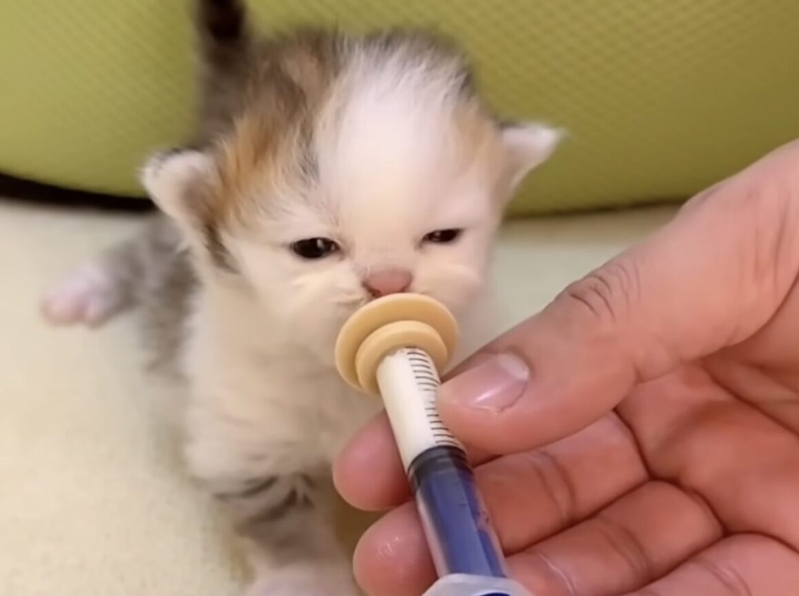 驚きの吸引力を見せる子猫。ミルクを飲む勢いがすごい!