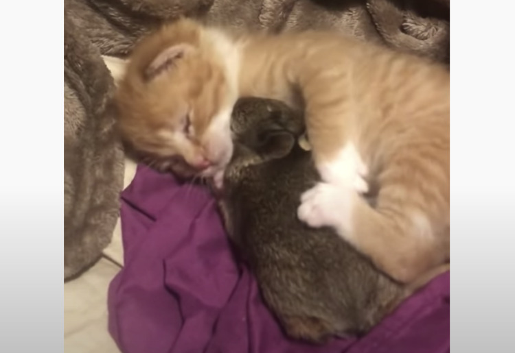 保護された子猫とうさぎの赤ちゃんが一緒にスヤスヤ、可愛い姿にキュンとする!