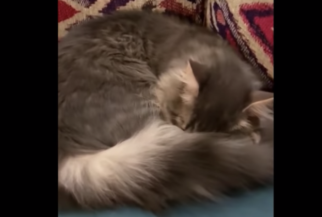 猫型マットの上でスヤスヤ♪ へそ天姿が可愛すぎ!