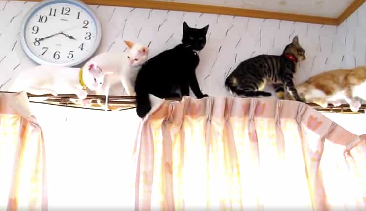 カーテンレールの上を一列で進んだ猫さん。 だけどその先は、行き止まり! えぇ〜っちょっと待って、と皆で猫バック。 追突、落下、カーテンずるずる… ありゃりゃりゃりゃ〜 [youtube https://www.youtube.com/watch?v=RtamjU65X00?rel=0&controls=0&a... -