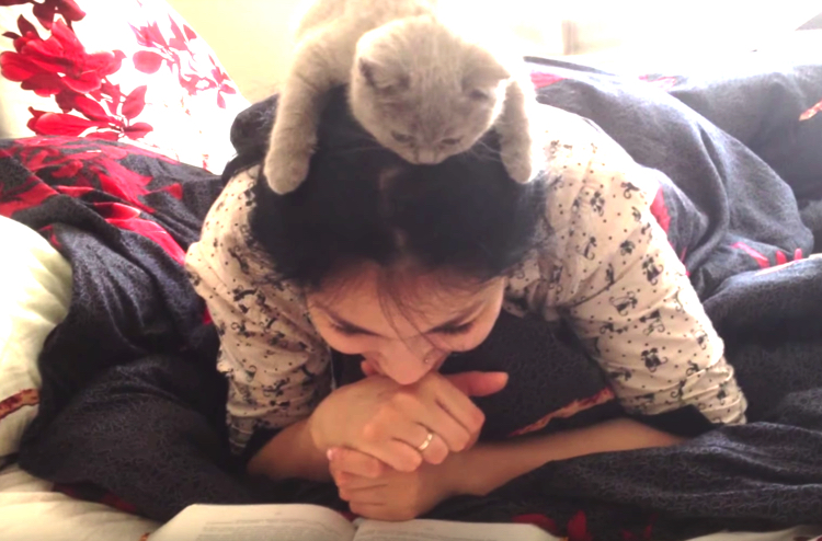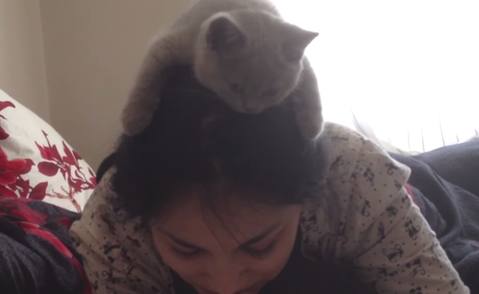 ベッドに横になり、読書をたのしむ飼い主さん。 と、そこに。よく見ると頭にちょこんとしがみつくねこちゃんが。 いっしょに読書に夢中に。ん〜、これはかわいい。